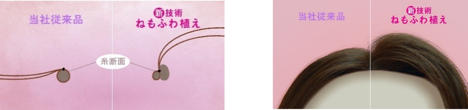 『イヴプレミアプラス』は、2024年9月に新発売したオーダーメイド・ウィッグで、レディスアデランスのサロンにて販売しています。「軽やかなふんわり感を持続させたい」とのお声から、"毛材が根元から立ち上がったエアリー感のあるウィッグ"を目指し、新たな毛植え技法『ねもふわ植え』(特許第7422908号)を開発。この技法により、気になる分け目やつむじもふんわりとしたスタイリングがしやすくなりました。