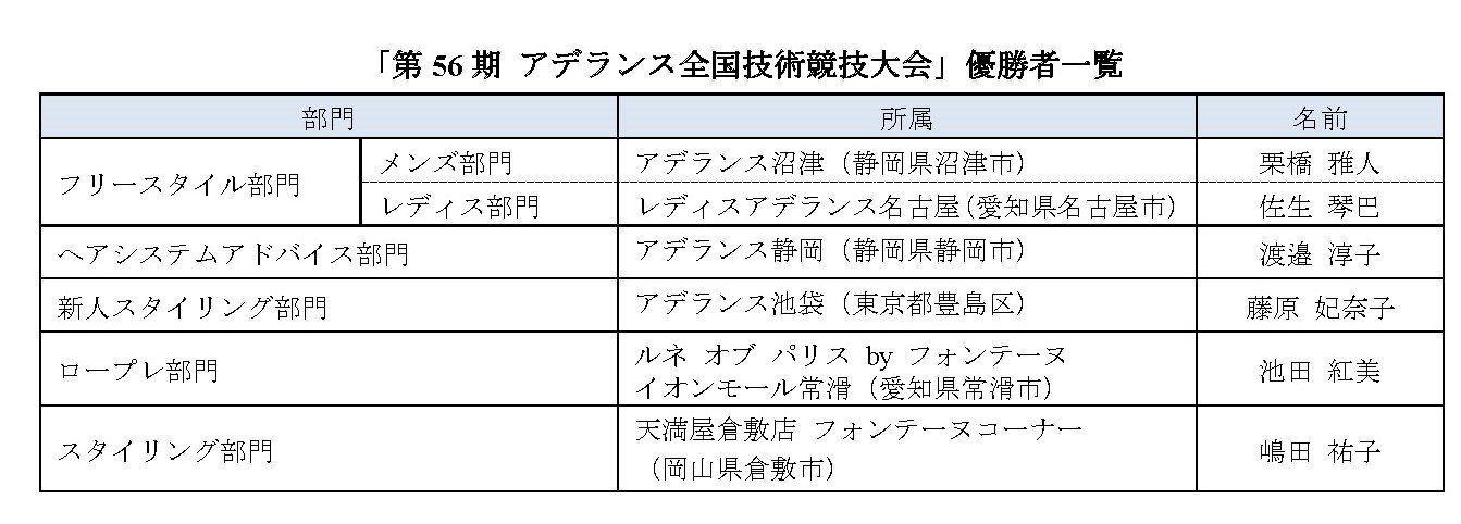 審査員の投票により各部門の優勝者を決定し、「フリースタイル部門(レディス)」では、レディスアデランス名古屋(愛知県名古屋市)の佐生 琴巴が、前回の「新人スタイリング部門」に続く優勝を飾りました。さらに、6名中4名が中京営業部から優勝を勝ち取る結果となりました。