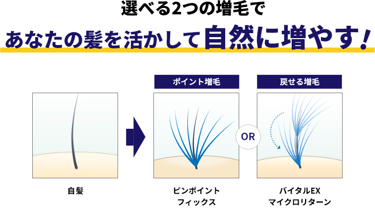 アデランスの増毛は、アデランスサロンのヘアスタイリストの手により、自社開発の人工毛髪などをご自髪に丁寧に結びつけて自然にボリュームアップします。人工毛髪は髪質などに合ったものを選択可能で、ご自髪1本に人工毛髪を1本ずつ結びつけるタイプや自髪1本に複数本を結びつけるタイプなどお好みに合わせてお選びいただけるメニューを多数ご用意しております※2。