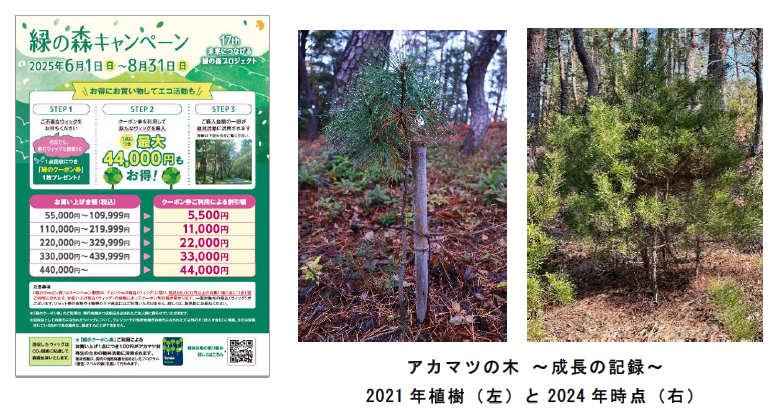 本キャンペーンでは、お客様が使われなくなったウィッグ(他社商品を含む)※3をフォンテーヌの店頭※1へお持ち込みいただいた際に、1点につき「緑のクーポン券※4」1枚を進呈しています。このクーポン券を利用して新たにフォンテーヌのウィッグをご購入いただくと割引価格が適用されます※5※6。また、お買い上げ商品1点ごとに売上金額の一部を、環境コミュニケーションを推進する合同会社ツバルの森(本社:東京都渋谷区、代表社員:三嶋 浩太)を通じて、静岡県立森林公園での植林活動に活用し環境保全につなげています。