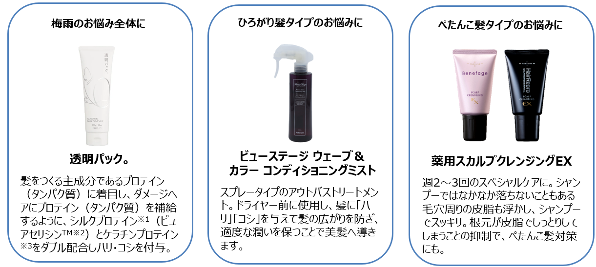 湿気が急増するこの時期は、代表的なお悩みとして、「うねり」「ひろがり」「ぺたんこ」があげられます。いずれのお悩みにもリンクするのが「空気中」と「髪内部」両方の水分量。髪の水分量は周囲の環境に影響されるため、湿度が高いと髪内部の水分量が増え、空気が乾燥していると減少します。髪の水分量が増えると、髪が膨潤し、膨らんだ状態になるのと同時に、髪内部の結合(主に水素結合)が一時的に切れて柔らかくなり、髪本来の性質にクセやうねりなどがあると、それが出やすくなります。そのため、ヘアスタイルが広がったり、崩れやすくなったりします。