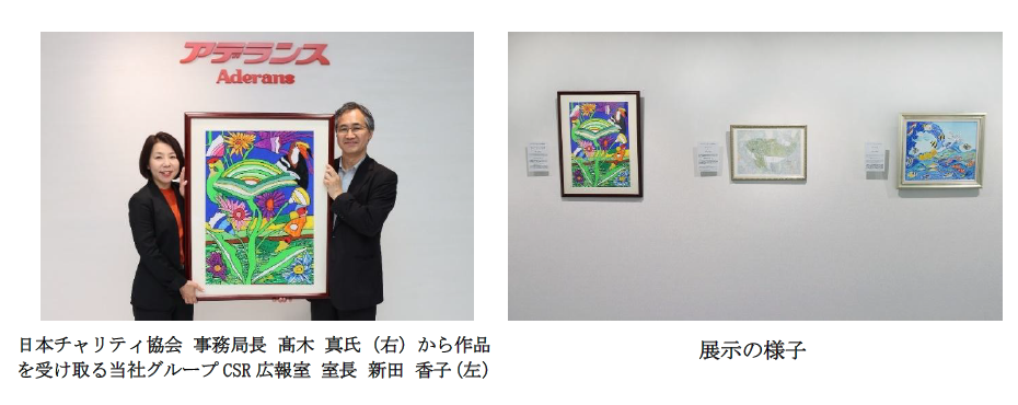 毛髪・美容・健康・医療のウェルネス事業をグローバル展開する株式会社アデランス(本社:東京都品川区、代表取締役社長 鈴木 洋昌)は、本社11階受付での「アデランス賞」受賞作品展示を7月8日(火)にリニューアルしました。「2024パラアート TOKYO 第11回国際交流展」(日本チャリティ協会主催)で、「アデランス賞」を授与した作品『チューリップと鳥』(谷口将郎さん作)に加え、『クジラ』(Yuiさん作、2021年受賞)も新たに追加し、現在は『なかま』(大山陽菜さん作、2023年受賞)を含む3作品を展示しています。