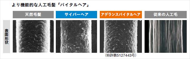 自社独自の技術で開発された「バイタルヘア」は、特性を天然毛髪に近づけながらも、より機能的な人工毛髪としての優れた特徴がある。