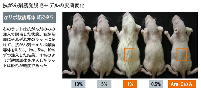 そこでこの3つを食い止めれば、脱毛を抑制できるのではないかと、我々が開発した抗酸化力が強いαリポ酸誘導体をラットのお腹に注射で投与したところ、αリポ酸誘導体が全身に回り、見事に脱毛が抑制されました。ただし、全身に回るということは副作用もあるかもしれない。そこで今度は、αリポ酸誘導体をクリーム状にして皮膚に塗布しました。そうしたら同じように効果が出たのです。炎症を起こす皮膚をターゲットにしているので、体表に塗るだけで投与でき、薬が到達できる、ということが分かったのです。
