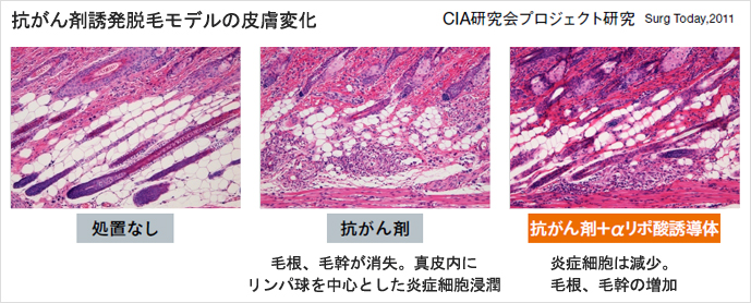 まず最初に、動物の抗がん剤による脱毛モデルを作りました。具体的には抗がん剤をラットのお腹に注射すると全身の毛が抜けていきます。そのときに脱毛の状態を観察して、組織学的に病理の顕微鏡で見たときにどんなことが起きているのかを調べました。