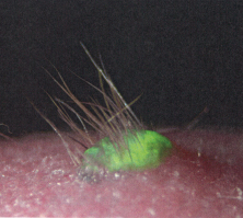 マウスiPS細胞から再生した皮膚(緑色)とその再生毛