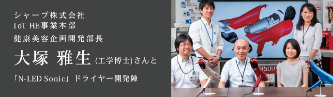 そこで、「N-LED Sonic」ドライヤーを開発したシャープ株式会社IoT HE事業本部を訪ね、シャープのモノづくり力の神髄に迫ってみました。取材に対応していただいたのは、健康美容企画開発部の大塚雅生部長と、開発に関与した各部門の方々です。