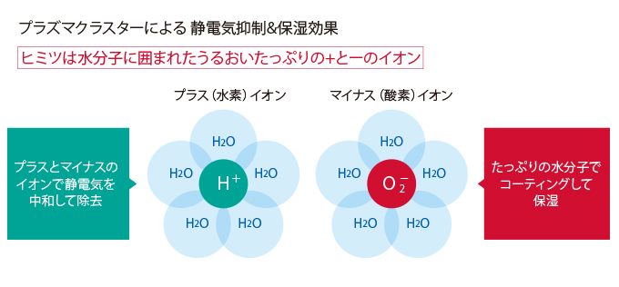 この+と−イオンですが、森の中や滝のまわりの大自然に満ち溢れている水素(H)の+イオンと酸素(O2)の−イオンのことです。ちなみにイオン濃度は都市部では1㎠あたり+と−イオンはともに200個ほどですが、森林では1㎠あたり+イオンは600個、−イオンは800個ほどが存在します。そこでプラズマクラスターは、プラズマ放電によって空気中の水分を電気分解し、自然界にあるイオンと同じ種類の+と−イオンを人工的に作り出しているのです。放出された+と−イオンには周りに水分子が寄り集まり、ぶどうの房(=クラスターの意)のようになって安定して空気中を飛びはじめます。これらの+と−イオン効果には次の三つの基本的な作用があります。