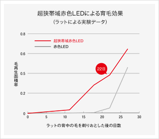 図1で撮影した写真から毛成長面積の割合を計算した。LED照射郡でday18、22において有意に毛成長が促進された。