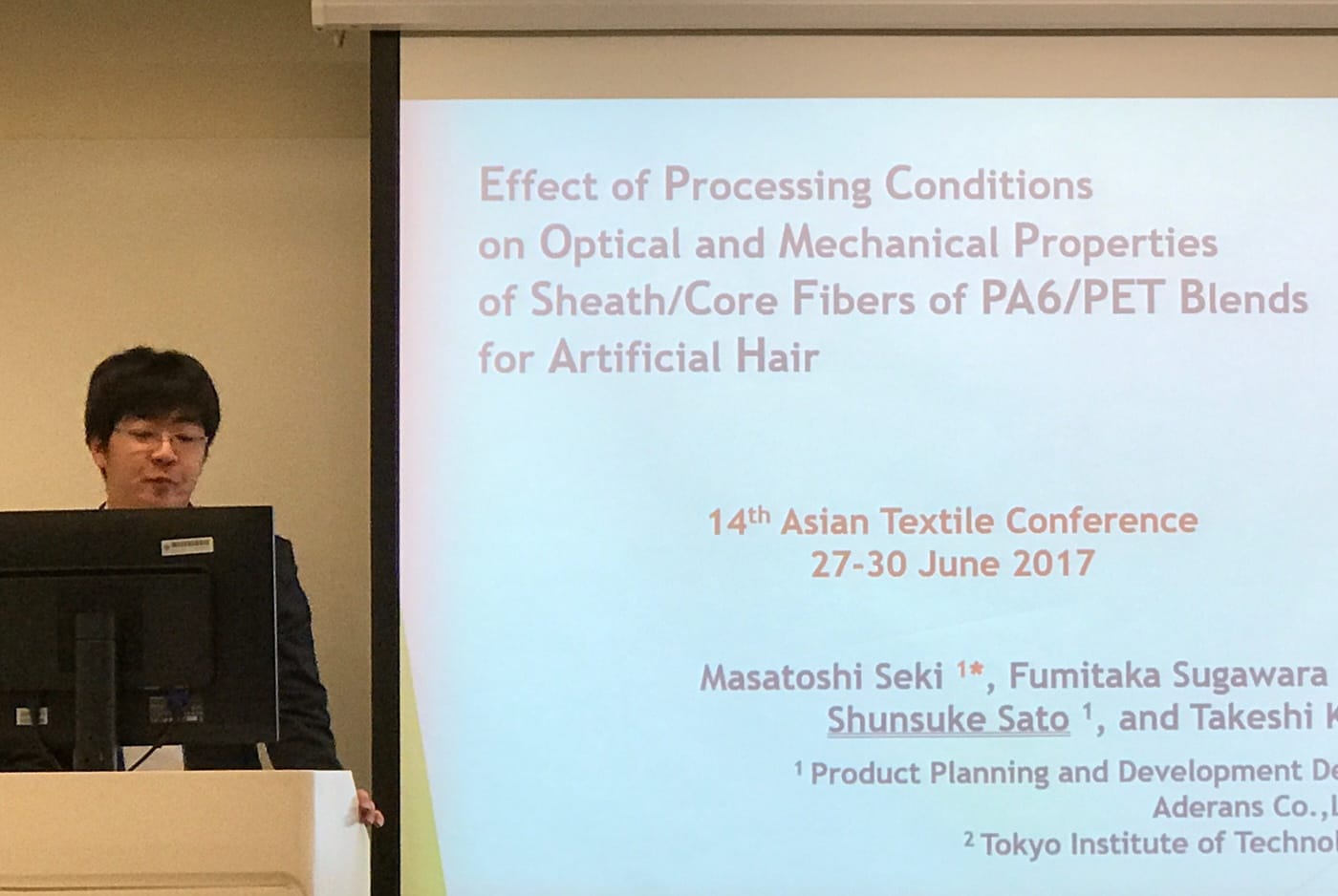 2017年6月に開催された「第14回アジア繊維会議」では、人毛に近い光反射特性(艶感)とウィッグ用人工毛髪として要求される強度・剛性の両立を、複合繊維の製造条件の最適化により達成した研究成果について発表を行い、「BestPaperAward:Tex-tileMaterial(テキスタイル材料分野における最優秀論文賞)」を受賞しました。アジア繊維会議は、繊維や布地に関する最新の研究成果を発表するフォーラムです。世界的な科学者や研究者を育成するためのプラットフォームとして隔年で開催されています。