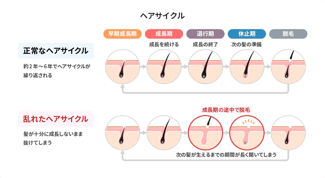 また、自律神経の乱れは髪の成長サイクル(= ヘアサイクル)にも影響を及ぼします。頭皮に栄養がいきわたらないことで、成長を続けるはずの髪の毛が十分に成長しないまま抜けてしまいます。