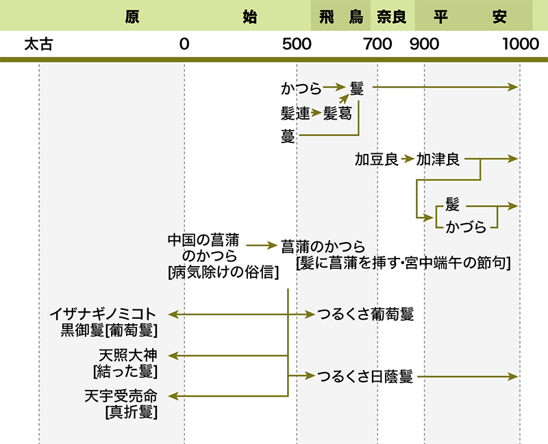 「か」は「髪」、「つら」は「つる」つまり「つるくさ(蔓)」を表現しています。それはさらに髪に連なる意味と、蔓が長く連なっていることなどから「髪連(かつら/[かみつら])」となり、「髪葛(かつら/[かみかづら])」となりました。植物の葛は鬘に通じています。漢字のつるくさは蔓と書き、日本ではかつらはくさかんむりを、かみかんむりにして鬘と転じました。つるくさは、もともと神秘的な力が宿っていると信じられていて、古代の人はこれを頭に巻いて祈りをささげていました。これは、今日の大嘗祭にも冠鬘として伝わっています。