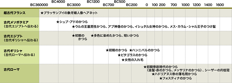 実質的な始源としては、約6,000年前(B.C.4,000)の古代メソポタミア、オベイドからウル期にかけてではないかと考えられます。当時の女王「シュブ・アド」が、環や桑の葉、花飾りのある櫛などで飾りつけたウィッグ(かつら)を使用したという資料が残っているのです。さらに、古代メソポタミアでは、約5,000年前(B.C.3,000)につくられた王の墓より、男性用のウィッグ(かつら)やウィッグスタンドも出土しています。また、同時期のアブ神像やイシュタル女神もかつらをつけ、メス・カラム・ドゥグ王の金の兜にはつけ髷があります。