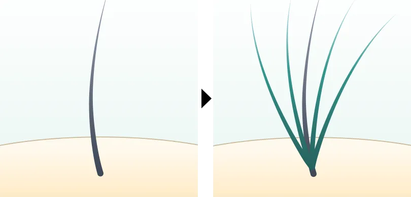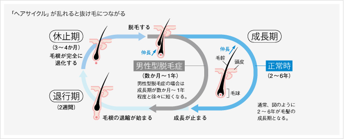 髪の毛には髪が成長した後、古い毛は抜けて次に新しい毛が生えてくる「ヘアサイクル」があります。しかし、男性ホルモンの一種であるジヒドロテストステロン(DHT)がヘアサイクルに影響を与えてしまい成長期が極端に短くなってしまうのです。