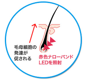 特定の波長を持つ赤色LEDの光を頭皮に照射すると、毛乳頭細胞から細胞増殖因子などが放出され毛乳頭細胞を刺激して毛母細胞を活性化する可能性があることが研究によってわかってきました。赤色ナローバンドLEDはこの科学的データに基づいた対処法で、大きな副作用もなく安全である点が特長です。