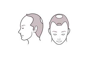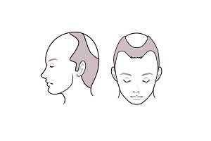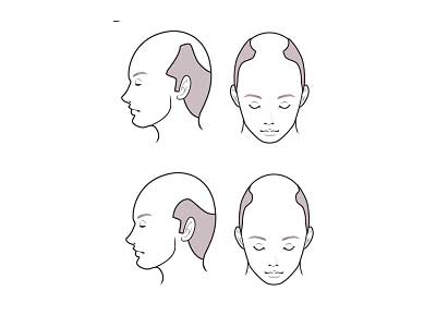 最初は生え際や頭頂部の毛髪が軟毛化する症状。さらに進行すると、生え際が後退して頭頂部も髪が薄くなり、脱毛範囲がどんどん広くなるという経過をたどります。