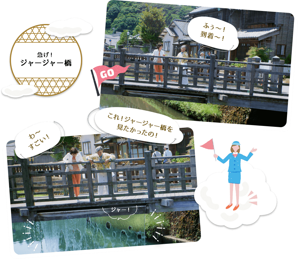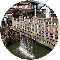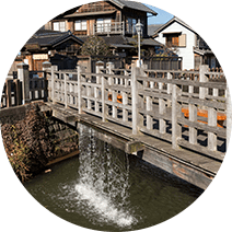 伊能忠敬旧宅前にある、小野川にかかる橋。300年近く使われ、橋の下側につけられた大樋を流れる水が、小野川にあふれ落ちて「ジャージャー」と音を立てるので、「ジャージャー橋」の通称で親しまれており、現在は30分ごとに落水させています。この樋橋の落水は「残したい日本の音風景100選」に選ばれています。