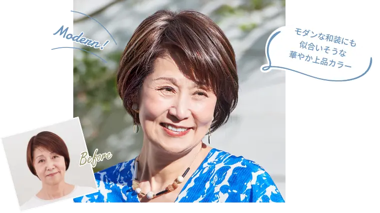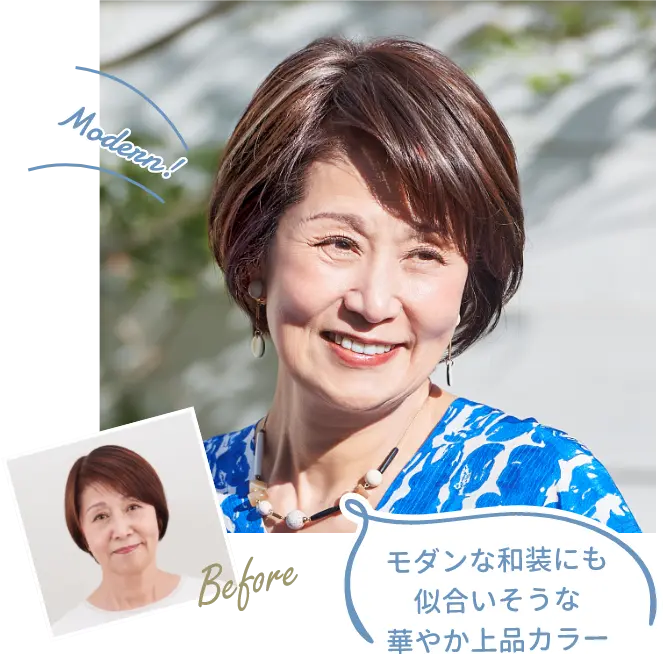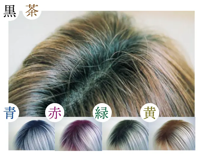 - 自髪の根元に施すヘアドゥ(染色加工) はへアスタイルにグラデーシヨン効果が得られ、美しく奥行きのある立体感が生まれ、ひときわ自然感を演出します。