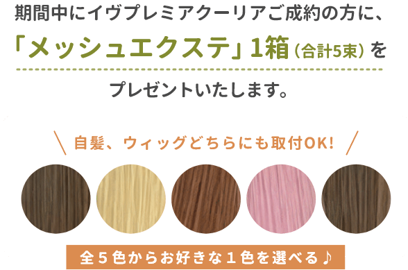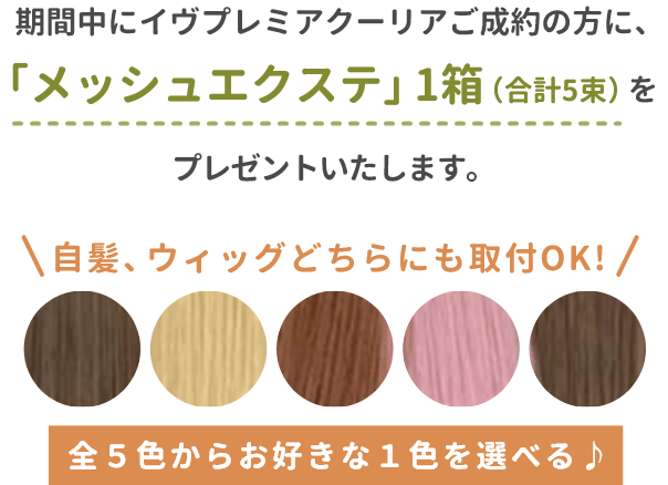 ※プレゼントはおひとり様一回、1箱限りです。納品時にお渡しとなります。(当日のお取付も可能) ※お取付は無料。チップを根元に戻す際は1束あたり220円(税込)がかかります。※本キャンペーンはレディスアデランスのみが対象です。展示試着会、病院内サロン、百貨店は対象外となります。※エクステのカラーは閲覧環境により実物と色味が異なる場合がございます。