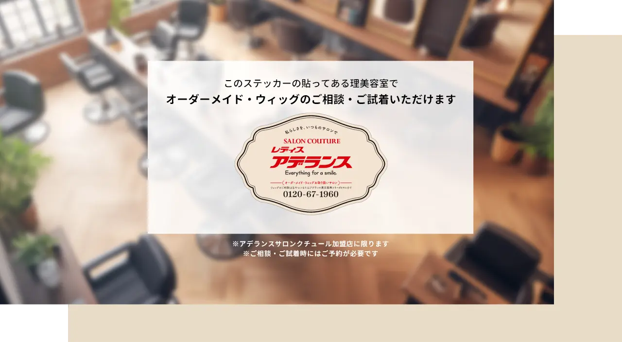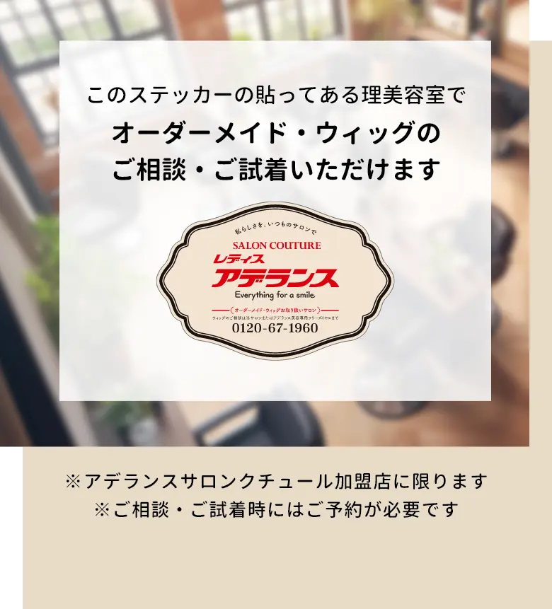 このステッカーのついている美容室でレディスアデランスのオーダーメイド・ウィッグをご相談したい旨をお知らせください。