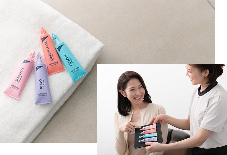 その日の気分に合わせてトリートメントをチョイス。もちろん、プロがあなたの髪質に最適な提案もしてくれるので安心です。