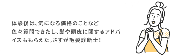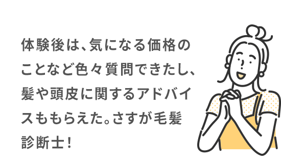 毛髪診断士®がご希望を伺い、最適な増毛方法や本数をご提案いたしますので、まずは体験や無料相談をお気軽にご利用ください。