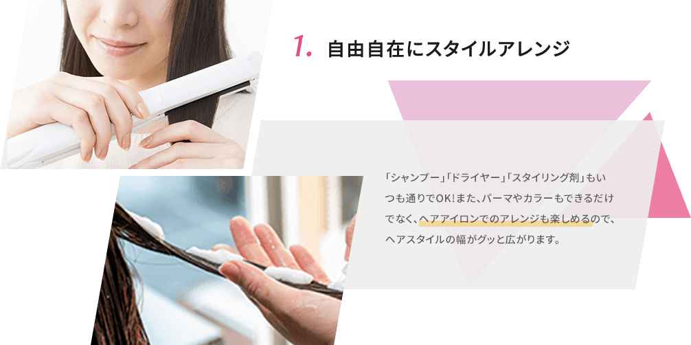 「シャンプー」「ドライヤー」「スタイリング剤」もいつも通りでOK!また、パーマやカラーもできるだけでなく、ヘアアイロンでのアレンジも楽しめるので、ヘアスタイルの幅がグッと広がります。
