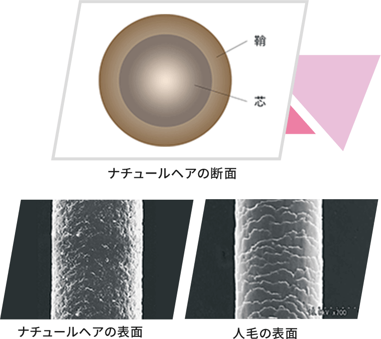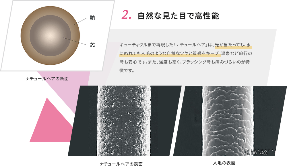 キューティクルまで再現した「ナチュールヘア」は、光が当たっても、 水にぬれても人毛のような自然なツヤと質感をキープ。温泉など旅行の時も安心です。また、強度も高く、ブラッシング時も傷みづらいのが特徴です。