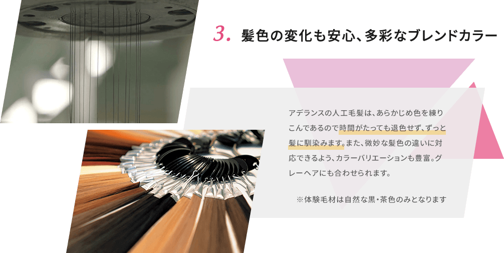 アデランスの人工毛髪は、あらかじめ色を練りこんであるので時間がたっても退色しにくく、髪になじみます。また、微妙な髪色の違いに対応できるよう、カラーバリエーションも豊富。グレーヘアにも合わせられます。