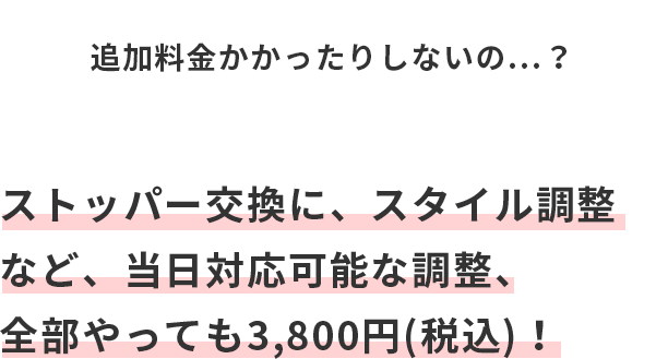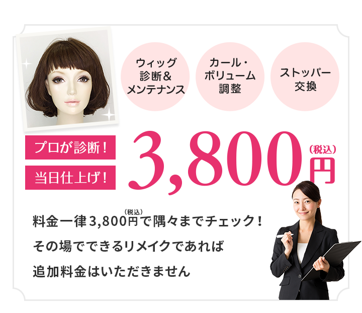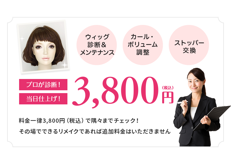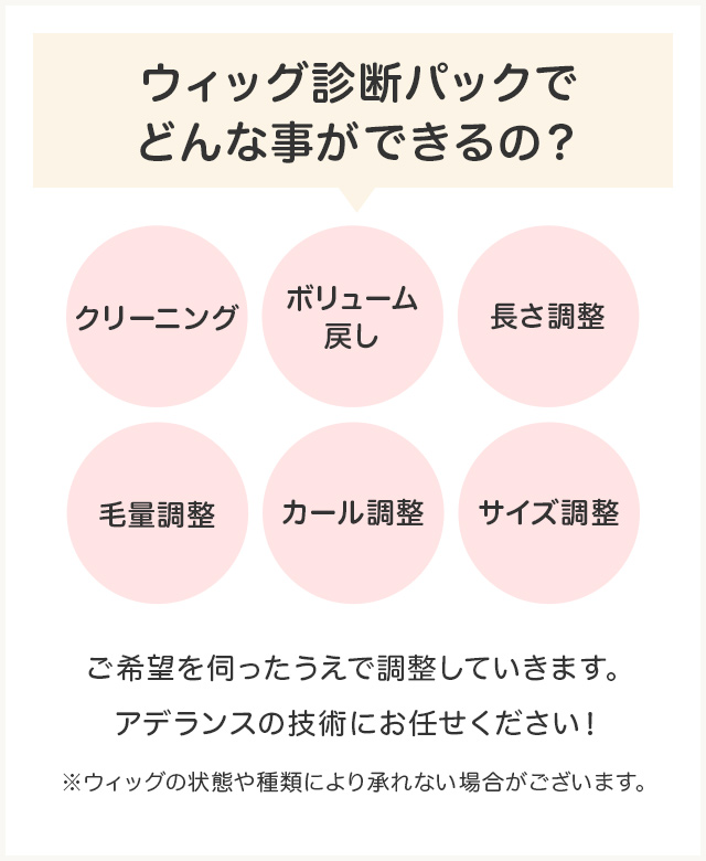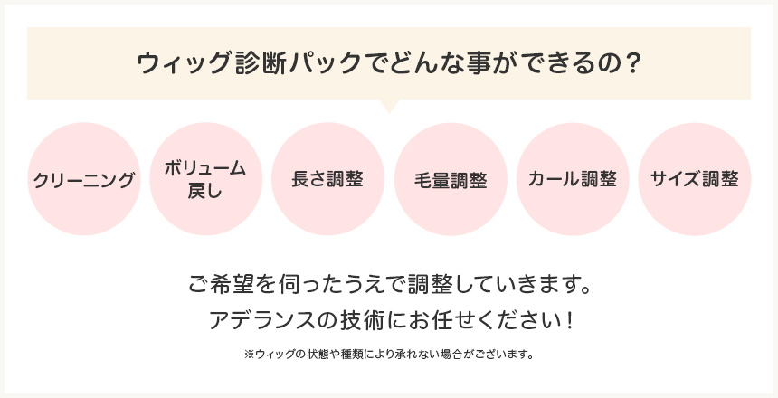 ウィッグ診断パックでは、クリーニング・毛量やカール、長さなどのスタイル調整・ストッパー交換など、当日対応が可能な調整なら追加料金はいただきません!