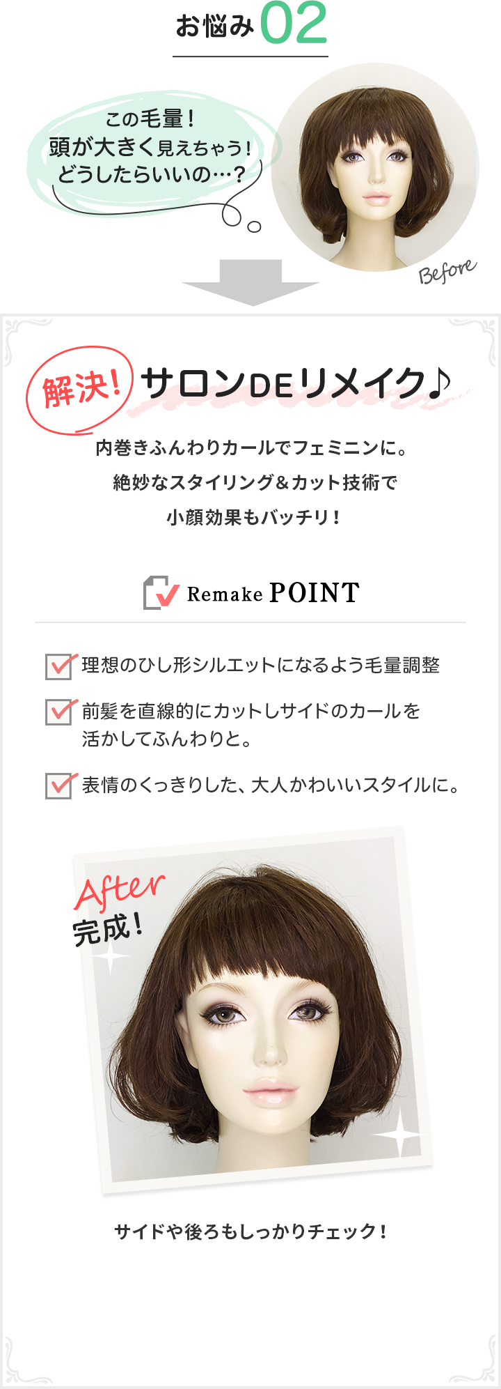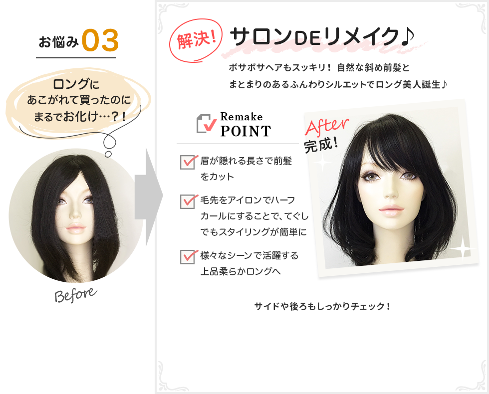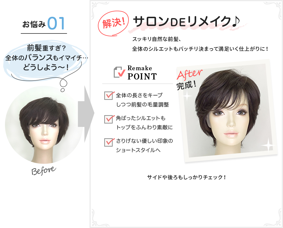 理容師または美容師の資格を取得した「サロンスタッフ」があなたのウィッグの状態をチェック!ウィッグのお悩みをズバリ解決!切りすぎたり、イメージと違ったり…ということが無いよう、目の前で仕上げてくれるから安心です。