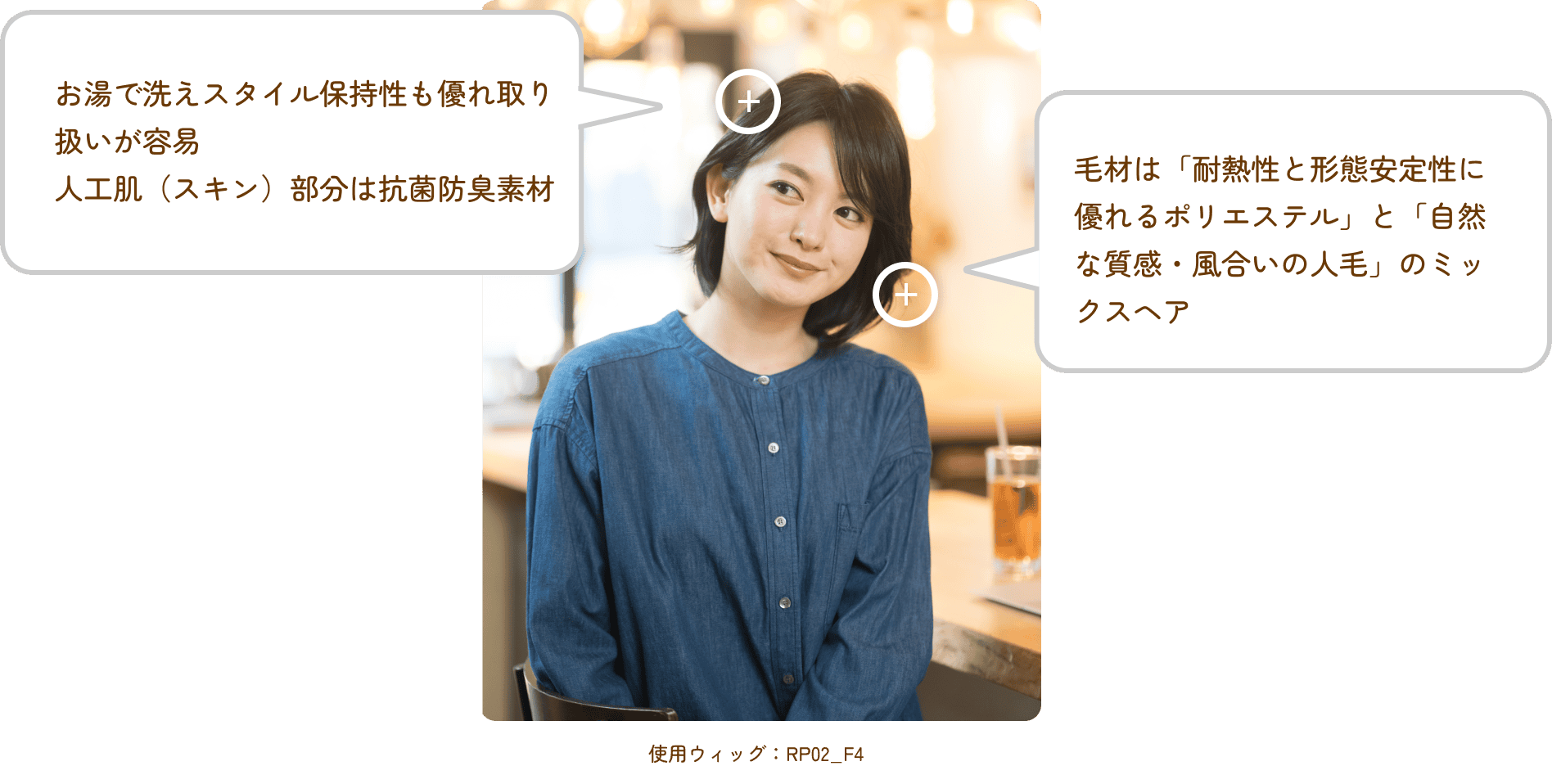 お湯で洗えスタイル保持性も優れ取り扱いが容易ベース資材は抗菌防臭加工素材 毛材は耐熱性と形態安定性に優れるポリエステルと自然な質感・風合いの人毛のMIX毛 使用ウィッグ:RP02_F4
