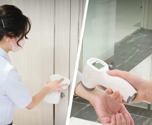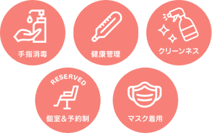 ・エタノールや次亜塩素酸消毒液などを用いた一客毎の清拭、清掃を実施いたします。