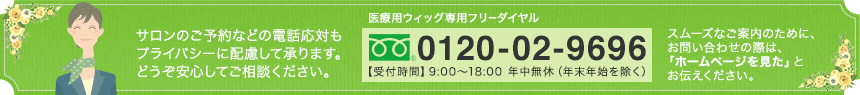 資料請求、試着予約、病院内ヘアサロンのご案内などはお気軽に。医療用ウィッグ専用フリーダイヤル 0120-02-9696 ※スムーズなご案内のために、お問い合わせの際は、「ホームページを見た」とお伝えください。