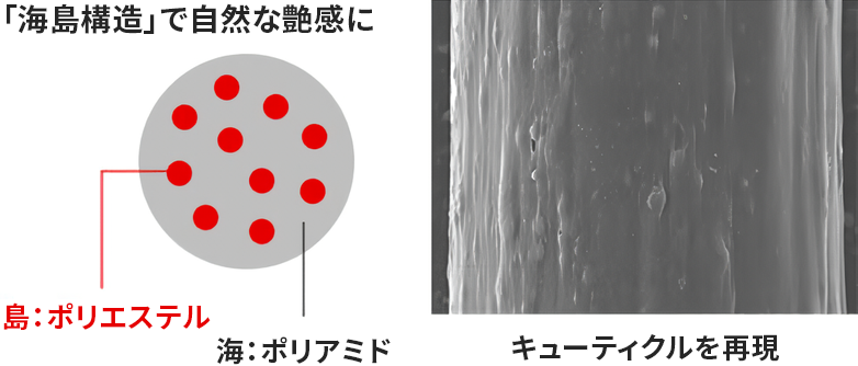 - 人毛のような自然なツヤ、見た目を実現「海島構造」(特許第5518857号)