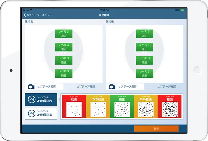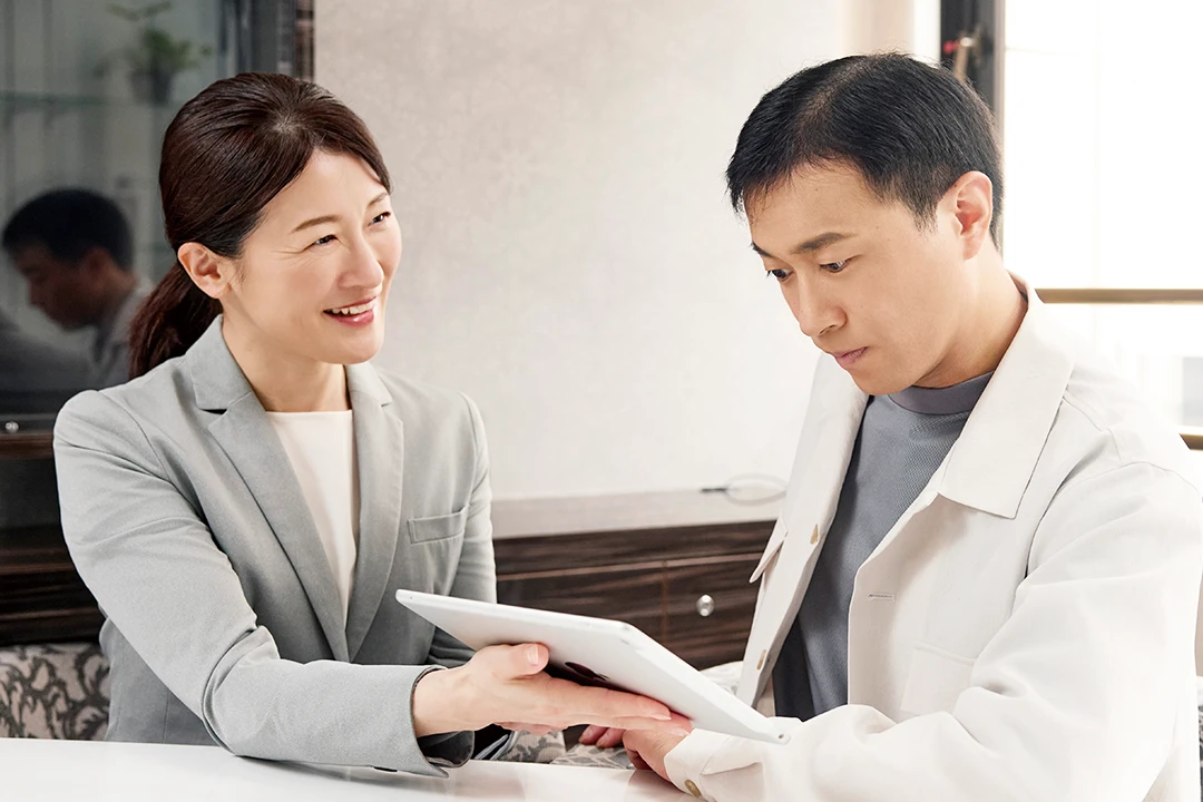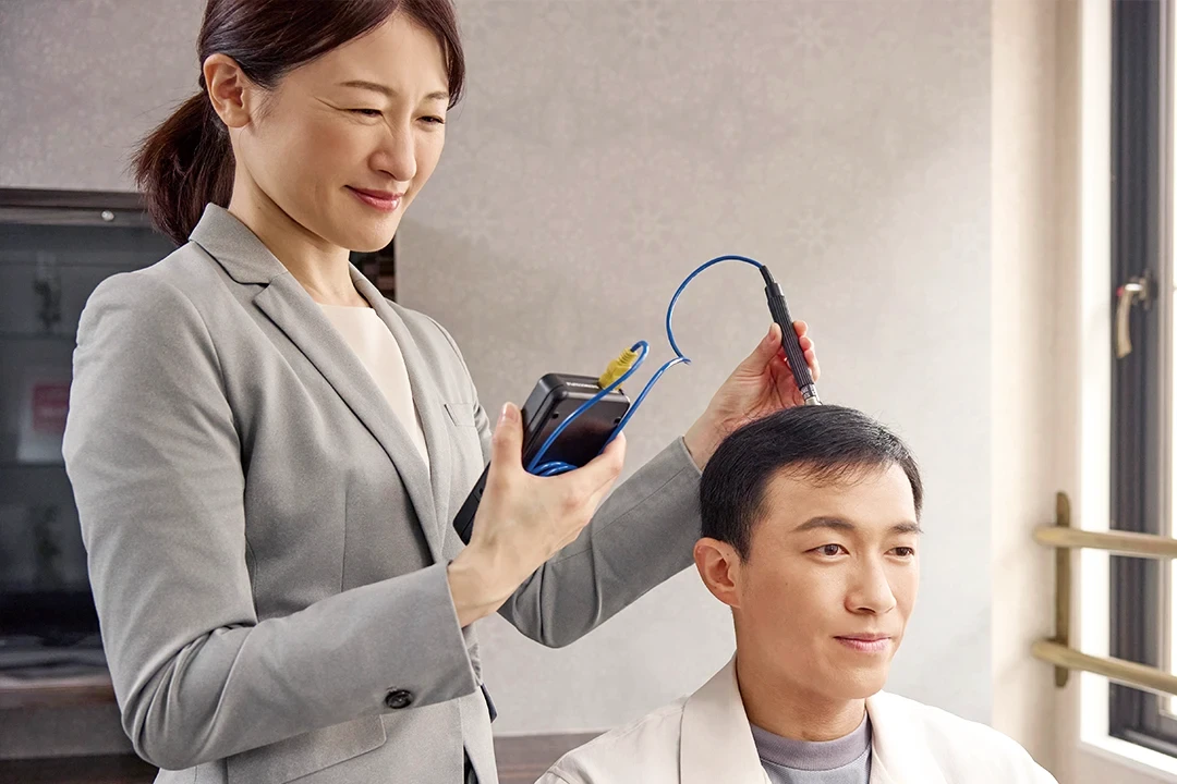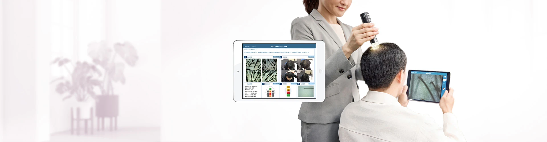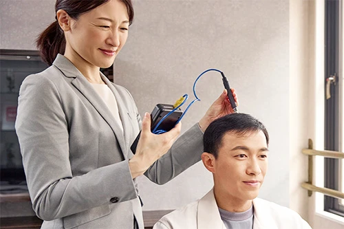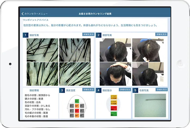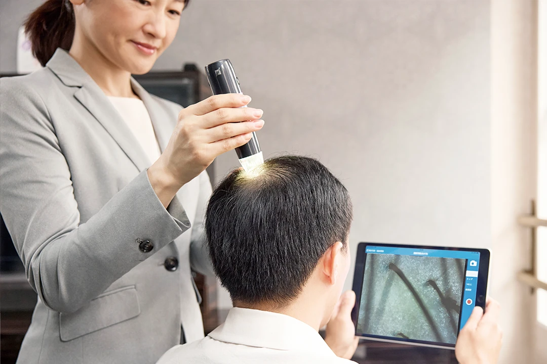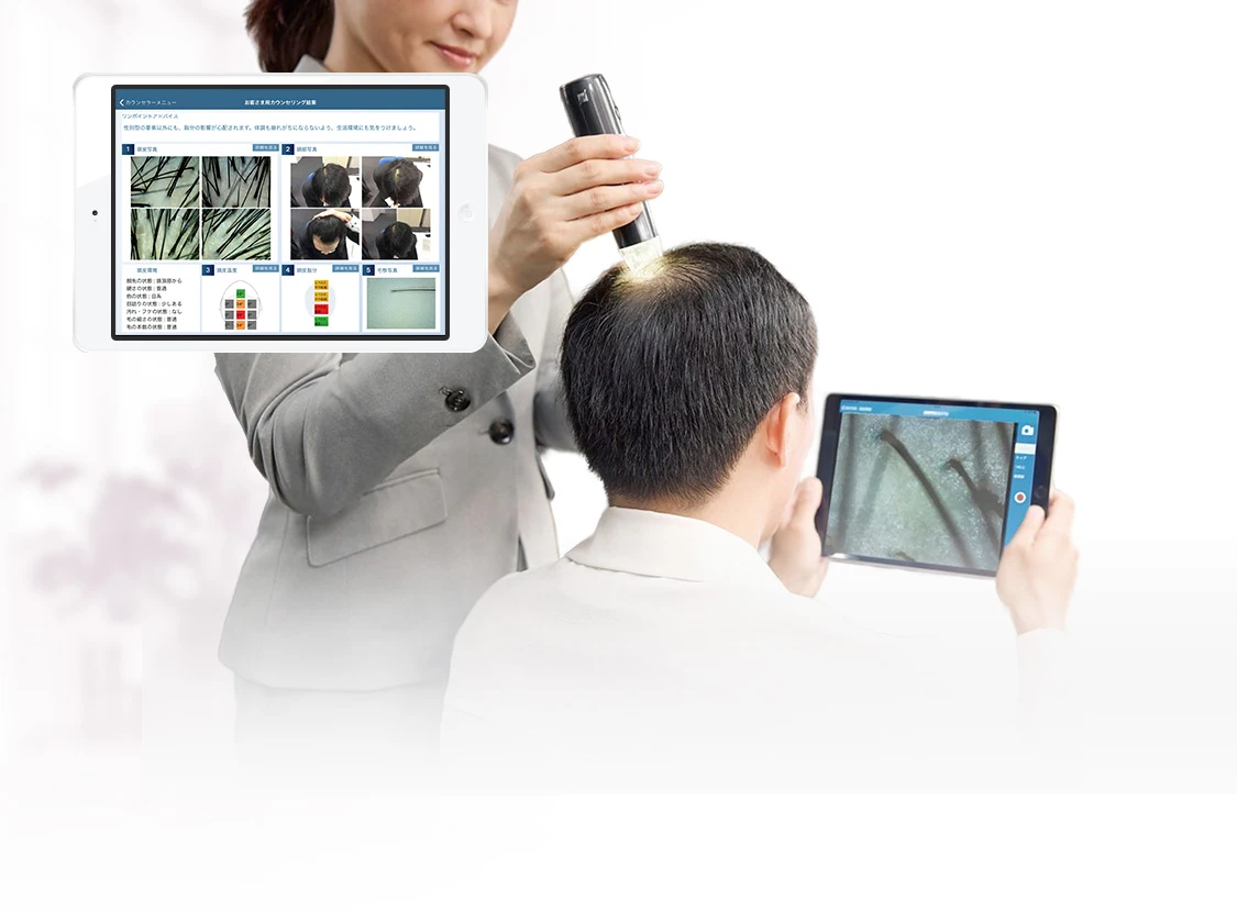 毛髪診断士®がお客様へのヒアリングと専用機器によるチェック結果をもとに、生活習慣とヘアケアの両面から抜け毛の原因や頭皮の状態を判断し効果的なアドバイスを行います。