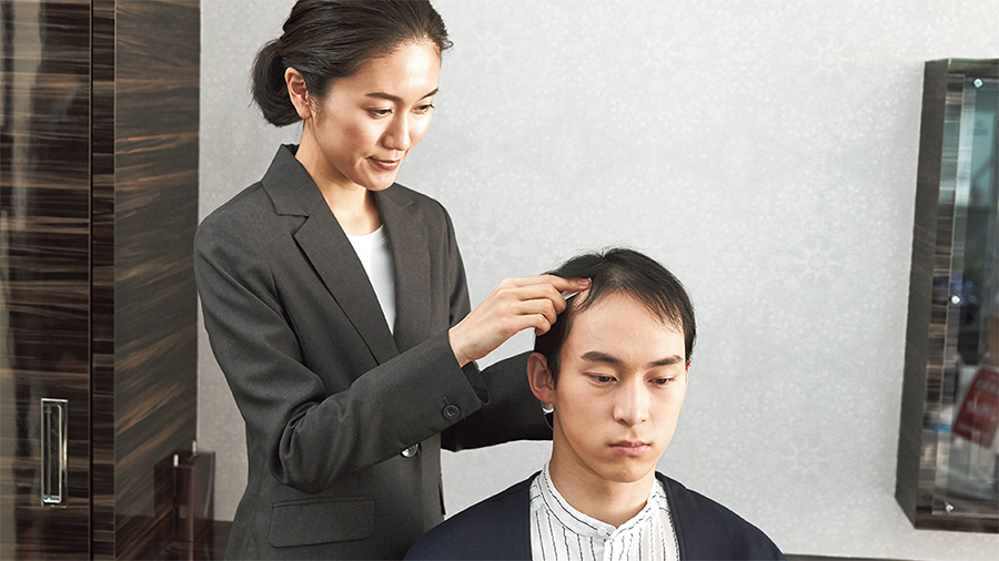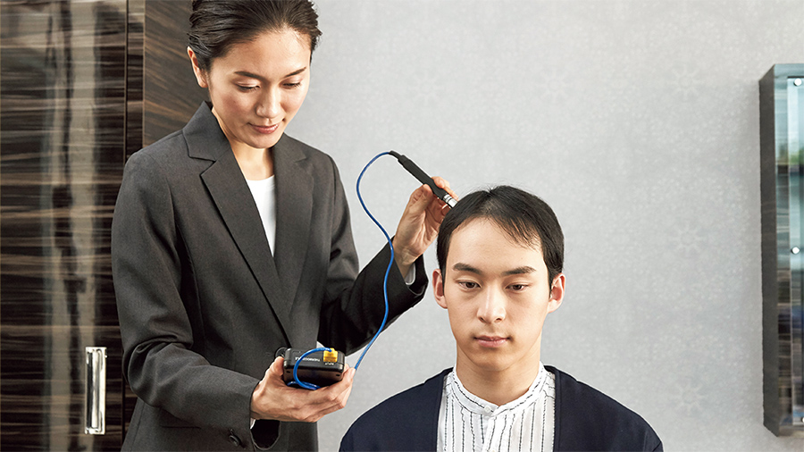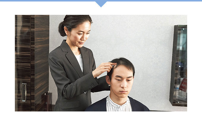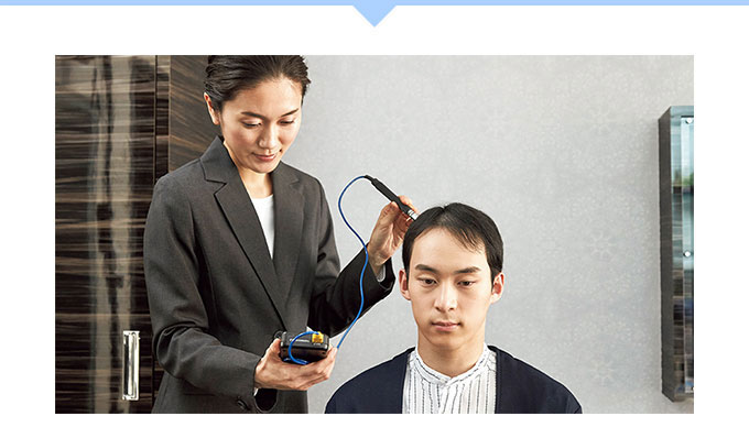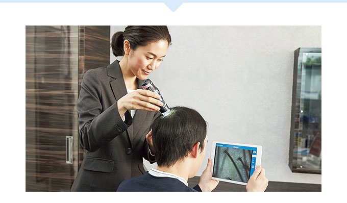 毛髪診断士®がお客様へのヒアリングと専用機器によるチェック結果をもとに、生活習慣とヘアケアの両面から抜け毛の原因や頭皮の状態を判断し効果的なアドバイスを行います。