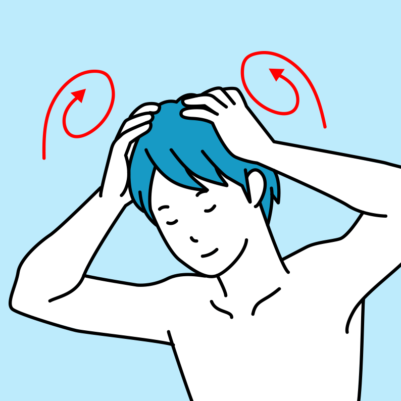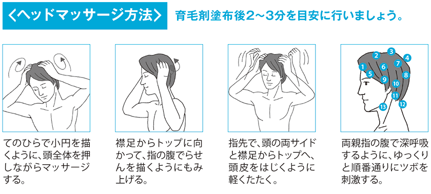 育毛剤塗布後、2~3分、頭皮に揉みこむようにマッサージします。朝晩2回がオススメ。