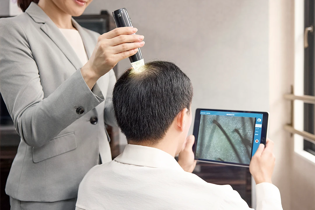 毛髪診断士®の資格を持つカウンセラーが、お客様からヒアリングした状況と専用機器でチェックした頭皮の状態を総合的に分析。チェック結果をもとに適切なカウンセリング、アドバイスを行います。