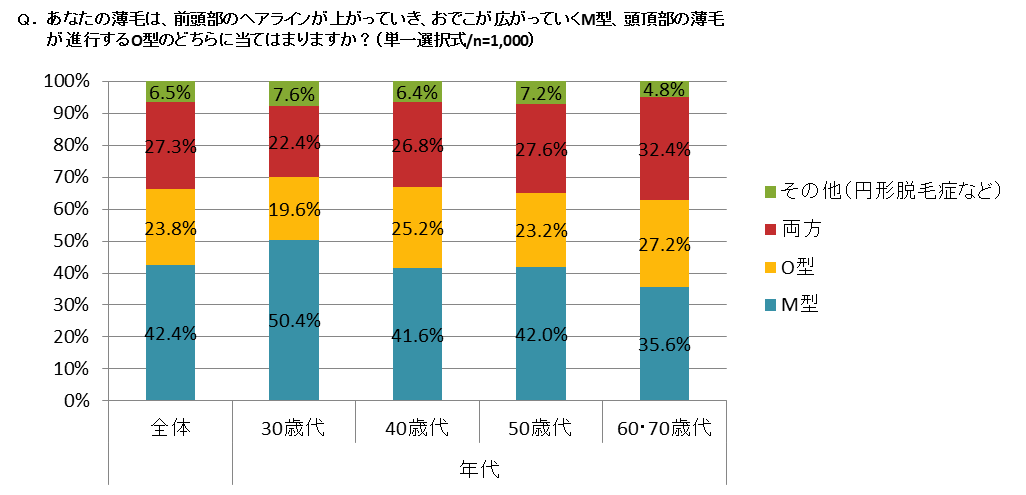 薄毛タイプについて尋ねたところ、30~70代の薄毛に悩む男性の42.4%が、前頭部のヘアラインが上がっていき、おでこが広がっていくM型の薄毛タイプであると感じており、若年層ほどその割合が多い傾向がみられました。一方、全体の23.8%が、頭頂部の薄毛が進行するO型の薄毛タイプと認識しており、主に40~70代に多くみられました。