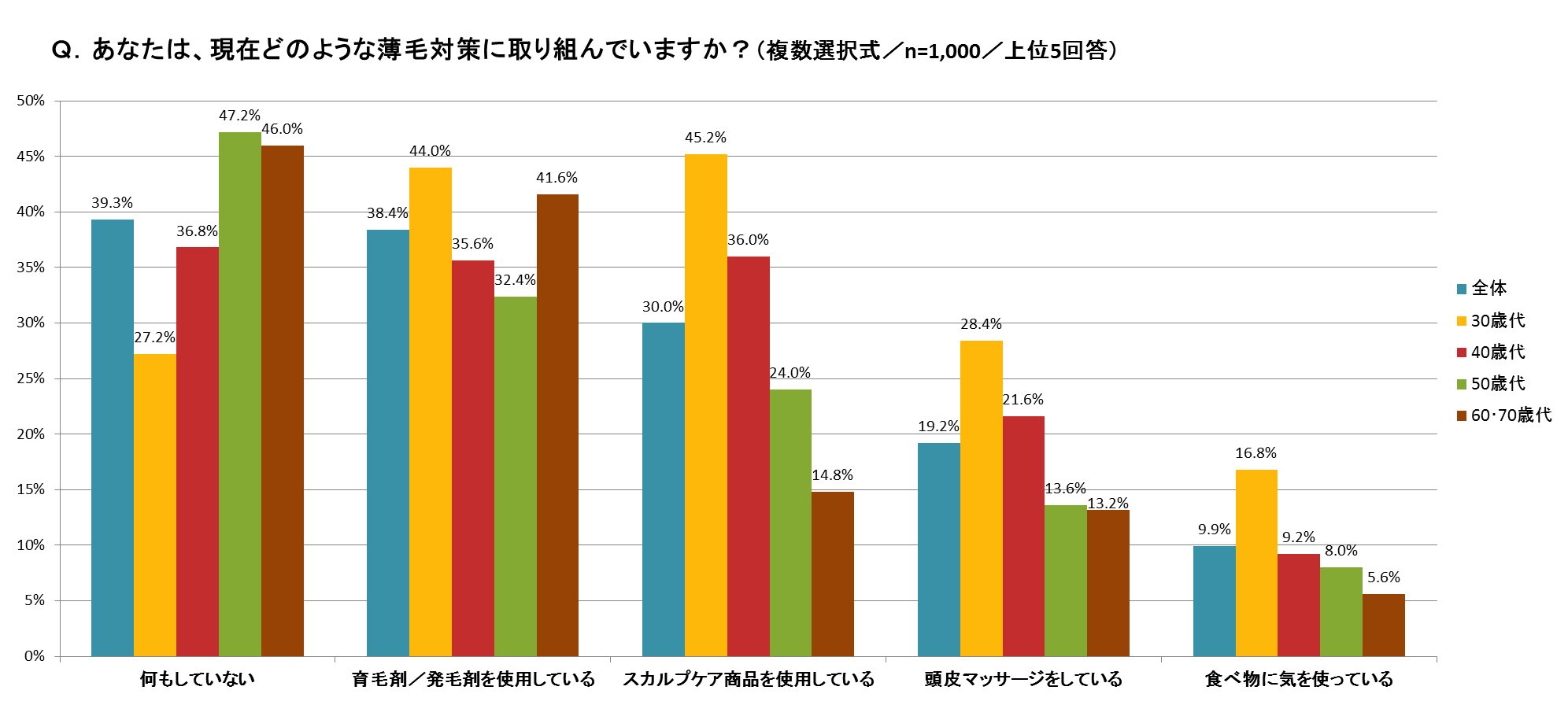 現在取り組んでいる薄毛対策について尋ねたところ、30代男性では「何もしていない」(27.2%)と回答した人を除く72.8%が日頃から薄毛の改善に取り組んでいることが判明しました。