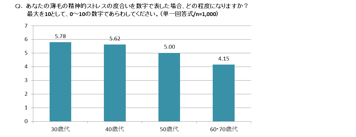 薄毛の精神的ストレスの度合いを1~10の値(10=最大)で尋ねたところ、若い年代ほどその度合いが高いことが分かりました。薄毛で一番ストレスに感じていることとしては、「恰好が良くない」(25.7%)が最も多く、年代を問わず多くの男性が髪型を身だしなみの重要な要素と考えていることが伺えます。