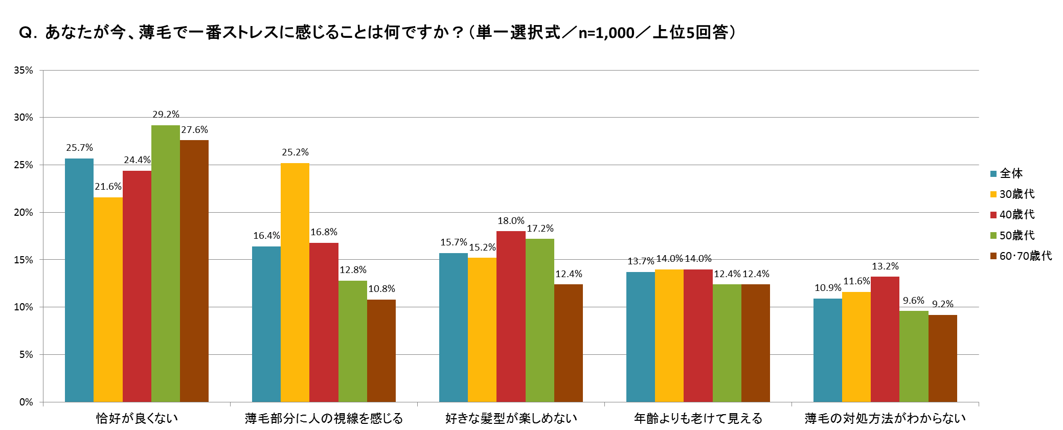また、若年層ほど薄毛であることに対してストレスを感じており、7割以上の30代男性が日頃から薄毛対策に取り組んでいることが判明しました。さらに、薄毛になって最もストレスに感じていることを尋ねたところ、全体では「恰好が良くない」の回答が25.7%で最も多い結果となりました。世代を問わず、多くの男性が髪型を身だしなみの重要な要素と考えていることが伺えます。