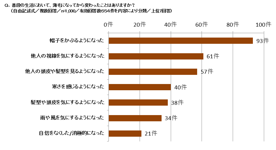 「普段の生活において、薄毛になってから変わったこと」について尋ねたところ、「帽子をかぶるようになった」が93件で最も多く、2位に「他人の視線を気にするようになった」(61件)、3位に「他人の頭皮や髪型を見るようになった」(57件)が続きました。また、少数意見として「プールや海で泳がなくなった」(8件)、「鏡を見なくなった」(4件)という回答も見られました。