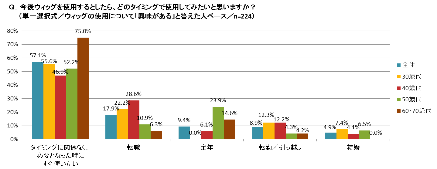 30~70代の薄毛で悩んでいてウィッグの使用に興味がある男性(n=224)に、ウィッグの着用タイミングを聞いてみたところ、「タイミングに関係なく、必要となった時にすぐ使用したい」の回答が全ての年代で最も多く、全体の57.1%を占めました。