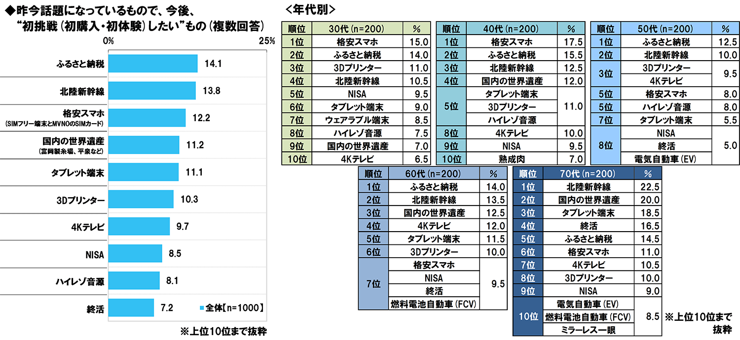 ■“初挑戦”したいもの 「ふるさと納税」「北陸新幹線」「格安スマホ」、30代・40代が今最も初挑戦したい「格安スマホ」、50~70代は「ふるさと納税」