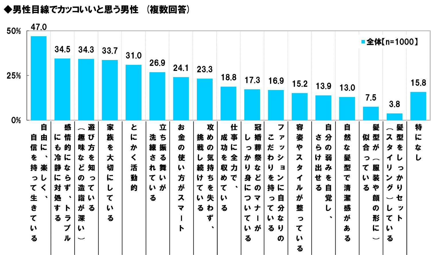 全回答者(1,000名)に対し、“男性目線でカッコいいと思う男性”について複数回答形式で聞いたところ、「自由に、楽しく、自信を持って生きている」が47.0%で最も高くなりました。まず、何をおいても自信を持って人生を楽しんでいる姿勢に、“男のカッコよさ”の秘密があるようです。次いで3割台で、「感情的にならず、トラブルにも冷静に対処する」(34.5%)、「遊び方を知っている(趣味などの造詣が深い)」(34.3%)、「家族を大切にしている」(33.7%)、「とにかく活動的」(31.0%)が続きました。いざという時にも頼れる男性、遊びを知っている男性、家族を大事にする男性などは、同じ男性目線からみても“カッコいい”と思えるようです。