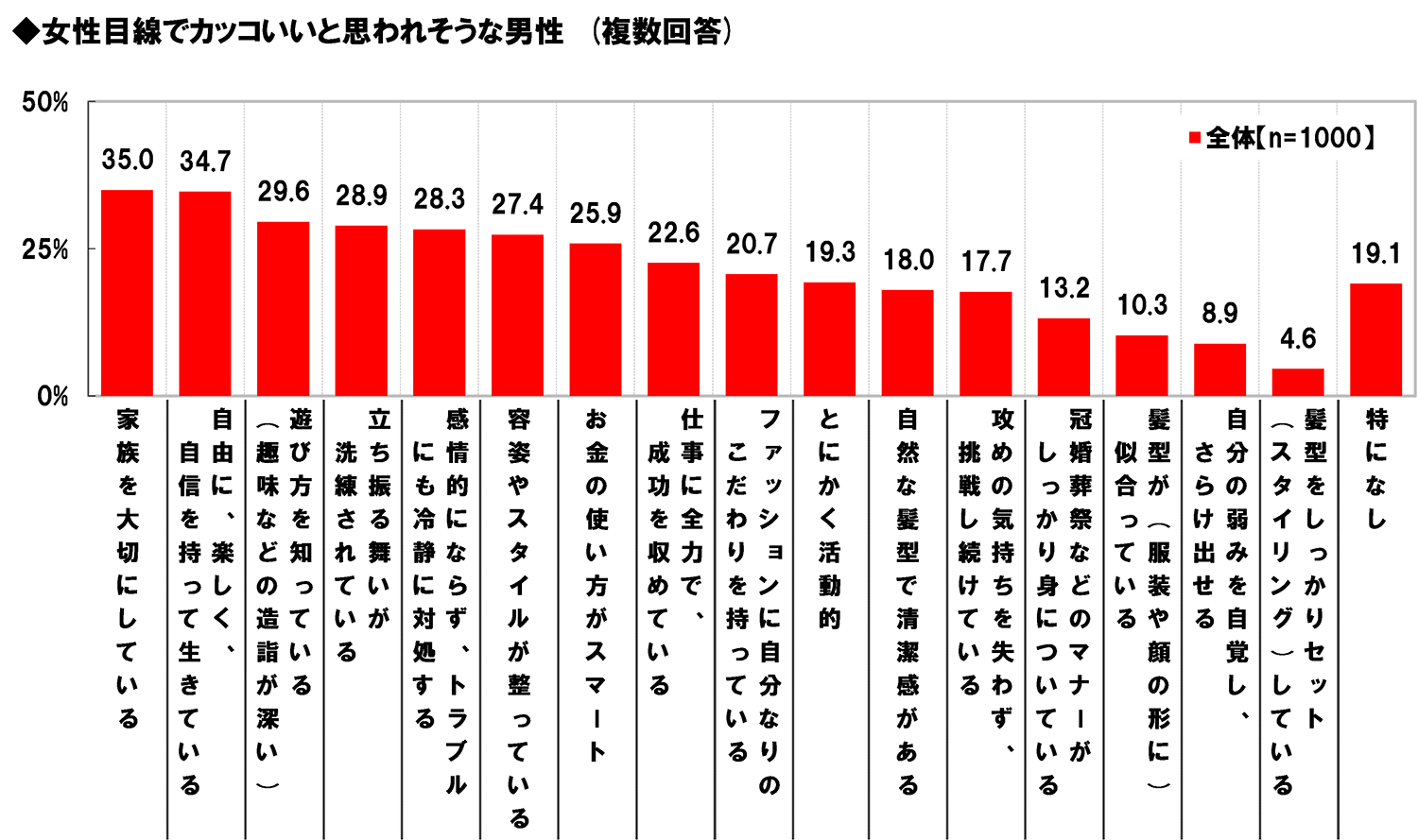 同様に、“女性目線でカッコいいと思われそうな男性”について複数回答形式で聞いたところ、「家族を大切にしている」(35.0%)と「自由に、楽しく、自信を持って生きている」(34.7%)が3割半となりました。家庭を大事にする男性、例えば、家事や育児などに積極的に参加する、いわゆる“カジメン”や“イクメン”は女性の目に魅力的に映るのではないか、と男性は考えているようです。そのほか「立ち振る舞いが洗練されている」(28.9%)や「容姿やスタイルが整っている」(27.4%)といった、身のこなしや身なりに関連する項目が上位に挙がりました。