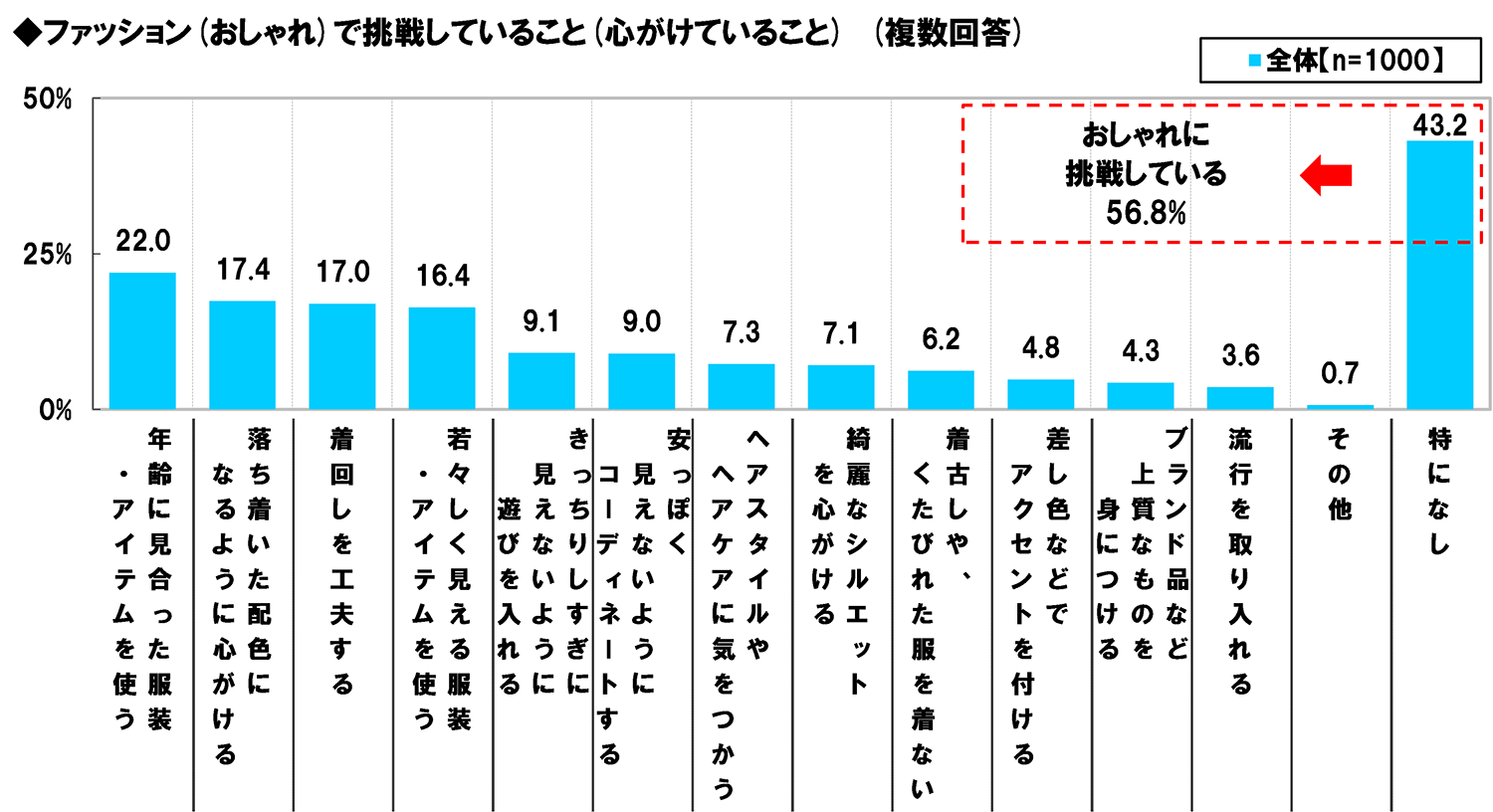 大人の男性はおしゃれに対してどんな心がけをしているのでしょうか。全回答者(1,000名)に対し、ファッション(おしゃれ)で挑戦していること(心がけていること)を複数回答形式で聞いたところ、「年齢に見合った服装・アイテムを使う」が22.0%で最も高く、次いで1割台で「落ち着いた配色になるように心がける」(17.4%)、「着回しを工夫する」(17.0%)、「若々しく見える服装・アイテムを使う」(16.4%)が続きました。若々しく見える装いよりも、年相応の装いや落ち着いた配色を意識している方が多いようです。また、「ヘアスタイルやヘアケアに気をつかう」(7.3%)や、「差し色などでアクセントを付ける」(4.8%)といった挑戦もみられました。なんらかの『おしゃれに挑戦している』割合は56.8%となっています。