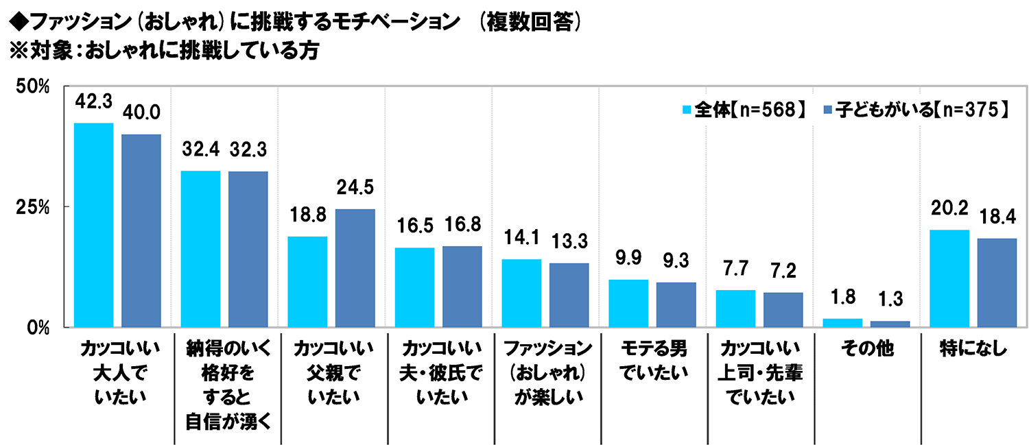 それでは、大人の男性は何のためにおしゃれに挑戦しているのでしょうか。おしゃれに挑戦している方(568名)に対し、ファッション(おしゃれ)に挑戦するモチベーションは何かを複数回答形式で聞いたところ、「カッコいい大人でいたい」が42.3%で最も高く、「納得のいく格好をすると自信が湧く」が32.4%、「カッコいい父親でいたい」が18.8%、「カッコいい夫・彼氏でいたい」が16.5%となりました。